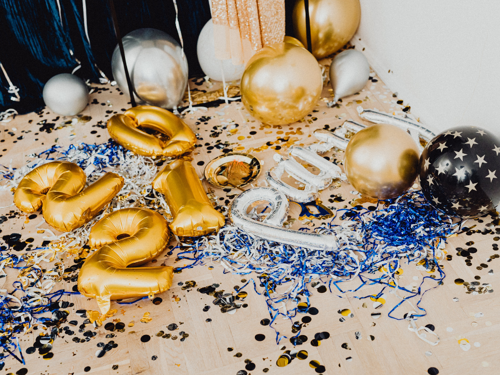 Ballons métallisés, banderoles personnalisées, confettis. Pour l'anniversaire célébration.